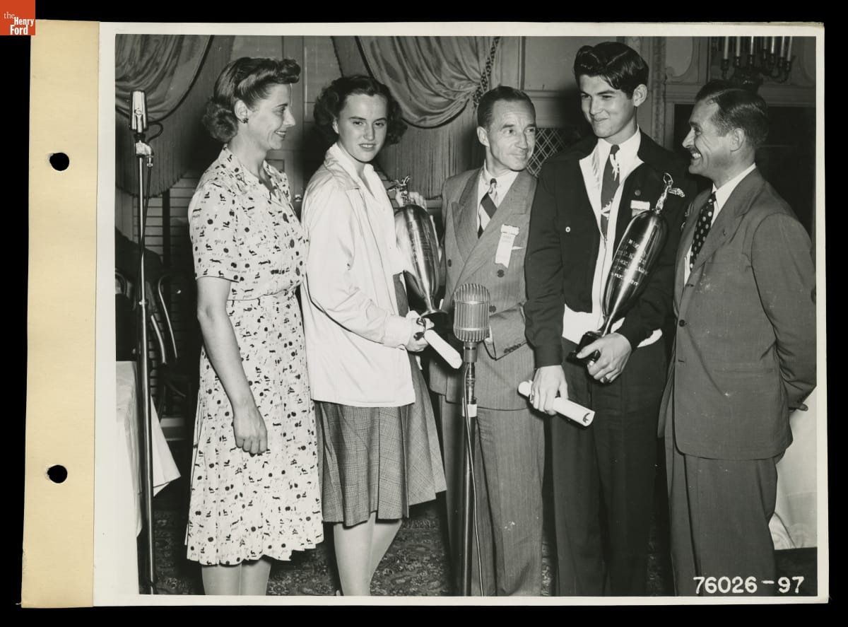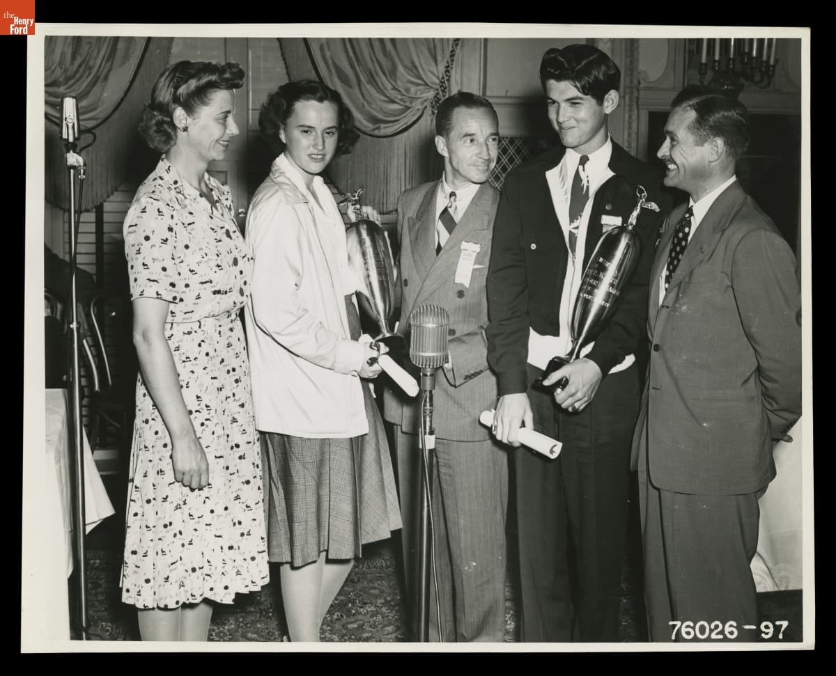 Ford Motor Company created the Good Drivers League in 1940 to promote safe driving habits among high school students. In 1941, boys and girls from 48 states and the District of Columbia came to Dearborn, Michigan, to compete for scholarships and trophies. National champions Patricia Borman and Kenneth Karr stand with Edsel Ford (center), tennis champion Alice Marble, and Indianapolis 500 winner Wilbur Shaw.