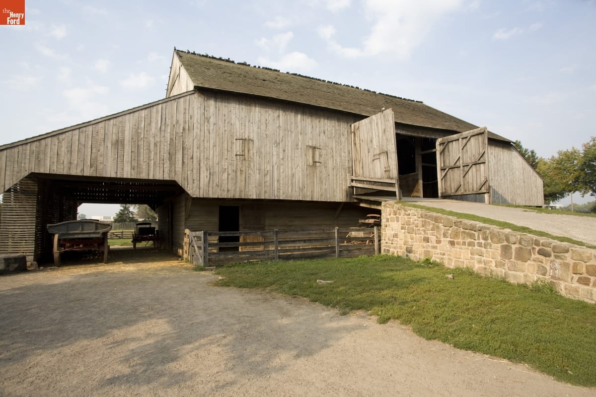 The Firestone barn is a Pennsylvania-German bank barn, an American barn type with Swiss origins. They are called bank barns because the barn is built into a bank, allowing wagons to be driven into the upper floor. Bank barns combined multiple farm functions under a single roof. Livestock were kept in the lower floor, crops on the upper floor.