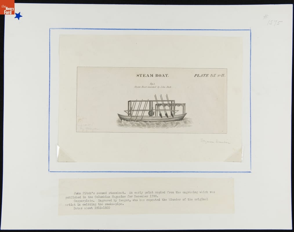 Connecticut-born entrepreneur and inventor John Fitch began building steam-powered boats in the 1780s. His first, Perseverance, was propelled by an unusual drivetrain of mechanized oars along both sides of the craft. The system was effective, but not particularly efficient. Fitch later experimented with screw propellers. He was unable to find commercial success with his designs.