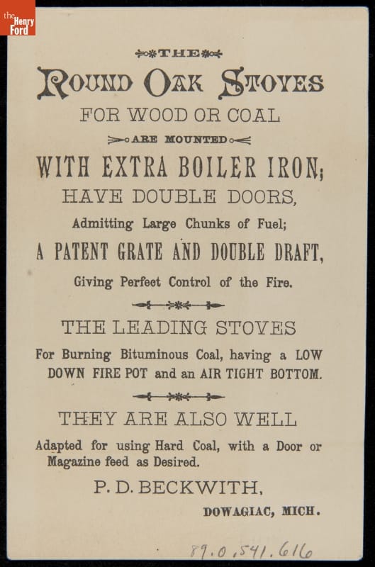Trade Card for P. D. Beckwith's Round Oak Stoves, 1870-1890