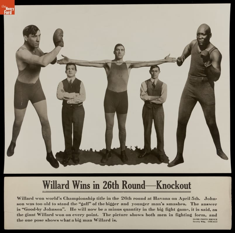 In a 1915 fight in Cuba, Jess Willard defeated Jack Johnson and became the new heavyweight boxing champion. The two men, in fighting stance, are depicted in this composite photograph. Another image illustrates Willard's 83-inch reach. At 6 feet, 6 inches (and a quarter), he was one of the tallest heavyweight champions in history.