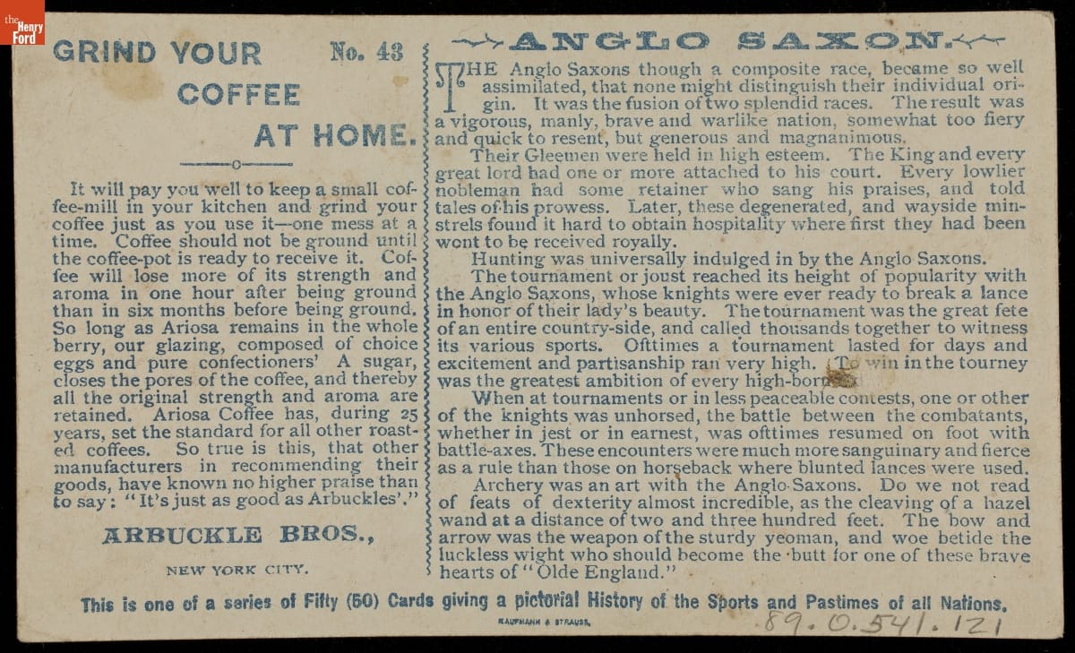Grocers sold coffee in bulk when John and Charles Arbuckle came up with an innovative process for individually packaging different grades of coffee. Their popular Ariosa coffee beans were glazed with a sugar and egg coating supposedly to improve quality and flavor. This trade card, from the Chicago Columbian Exposition, was in a series depicting different nations' sports and pastimes.