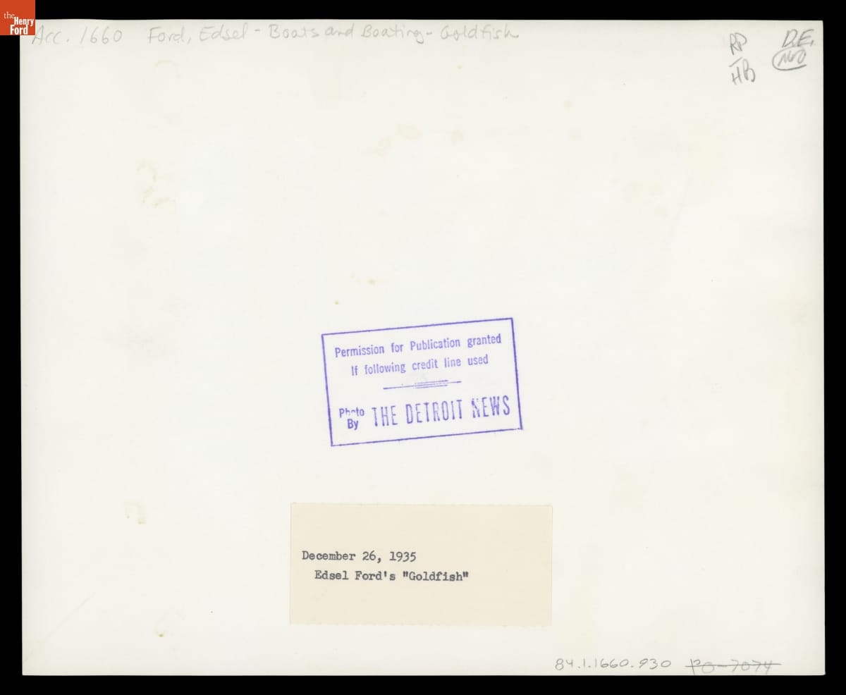 Edsel Ford enjoyed boating. He owned an impressive collection of watercraft, from large pleasure yachts to smaller powerboats. Ford competed, as an owner, in the Gold Cup boat races in Detroit in 1922 and 1923. This photograph shows Goldfish, one of Ford's competition boats.