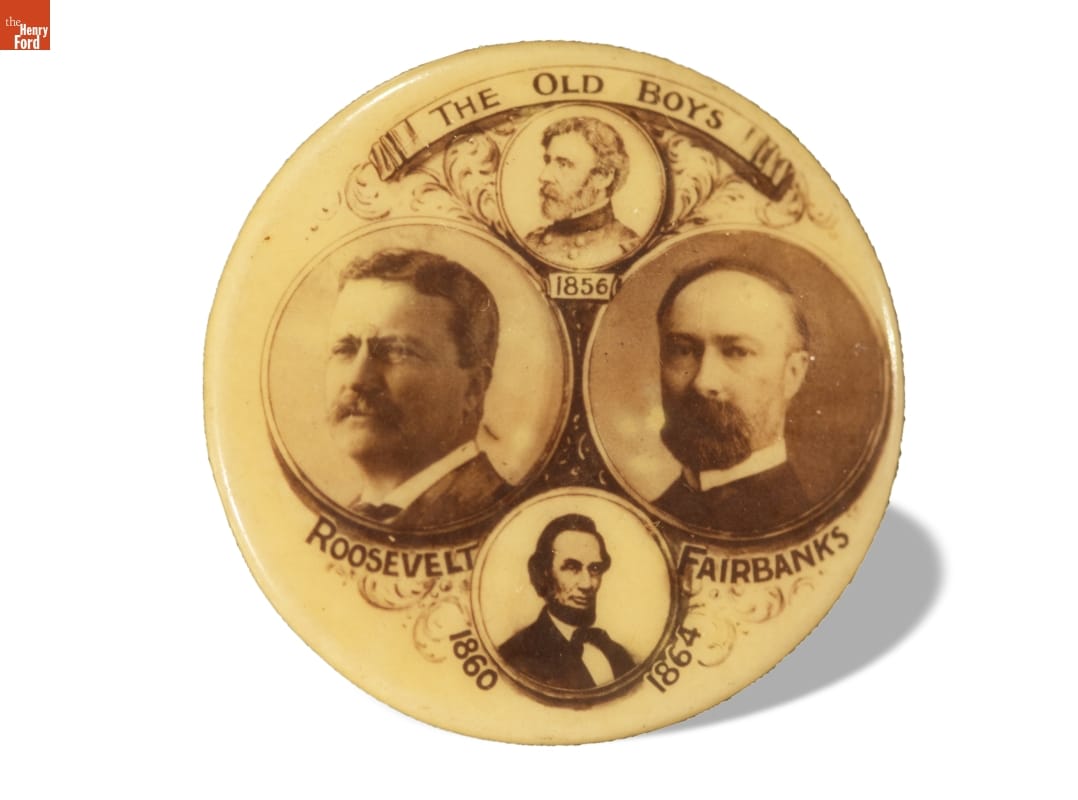 Having assumed the presidency when McKinley was assassinated in 1901, Theodore Roosevelt was already immensely popular when he ran for president in 1904. Picking conservative Senator Charles W. Fairbanks as his running mate, Roosevelt was reelected in a landslide. Two previous highly esteemed Republicans--John C. Fremont (first Republican presidential candidate) and Abraham Lincoln--are also depicted on this button.