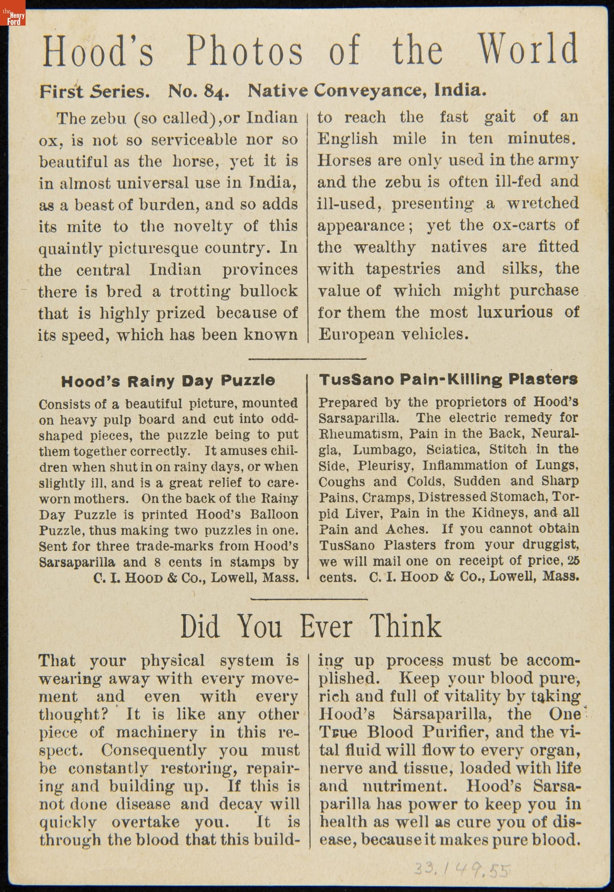 In the late 19th century, trade cards were a major means of advertising goods and services. Patent medicine producer, C.I. Hood & Co., had its own advertising department, creating cookbooks, calendars, and, most abundantly, trade cards. The trade card series, "Hood's Photos of the World," became popular among consumers, as it offered views of far-away places, providing a window to the broader world.