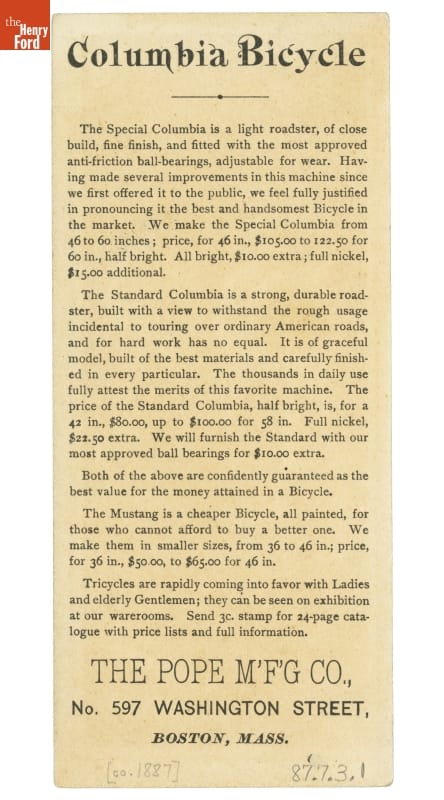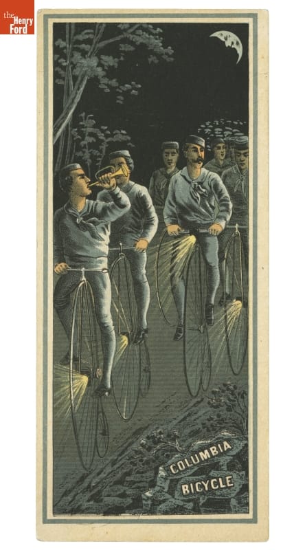 The Pope Manufacturing Company handed out this trade card depicting a nighttime parade of bicycle club members on Columbia bicycles. Trade cards, like this one, usually had colorful and interesting scenes on the front and product information on the back.