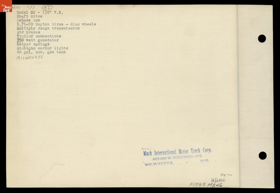 typewritten on back: Model BM - 138" W.B., Shaft Drive, DeLuxe cab, 9.75-20 Dayton tires - disc wheels, Multiple Range transmission, Air Brakes, Trailer Connections, 350 watt generator, Helper Springs, Michigan marker lights, 40 gal. aux. gas tank. handwritten on back: Milwaukee blue ink stamp on back: Mack International Motor Truck Corp. 4423-4439 W. Wisconsin Ave. Milwaukee, Wis.