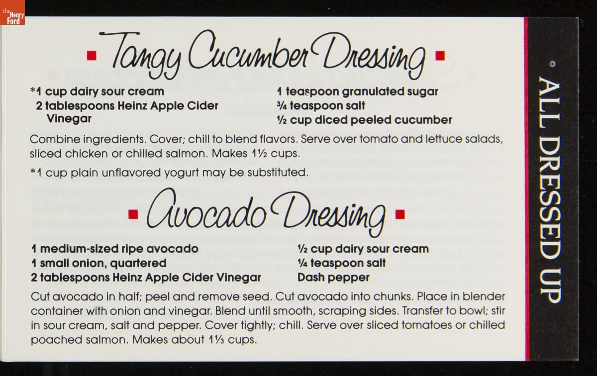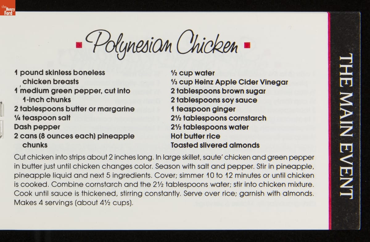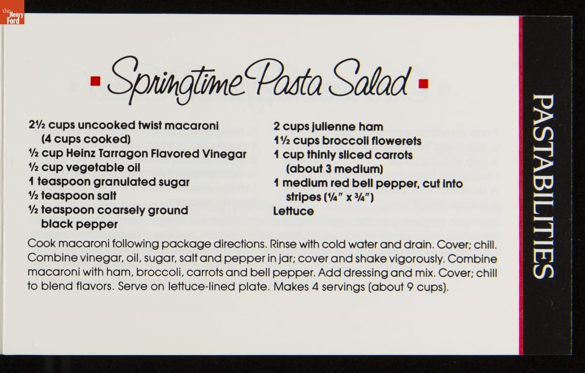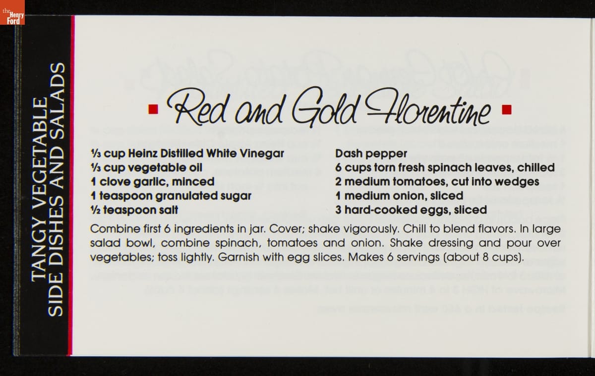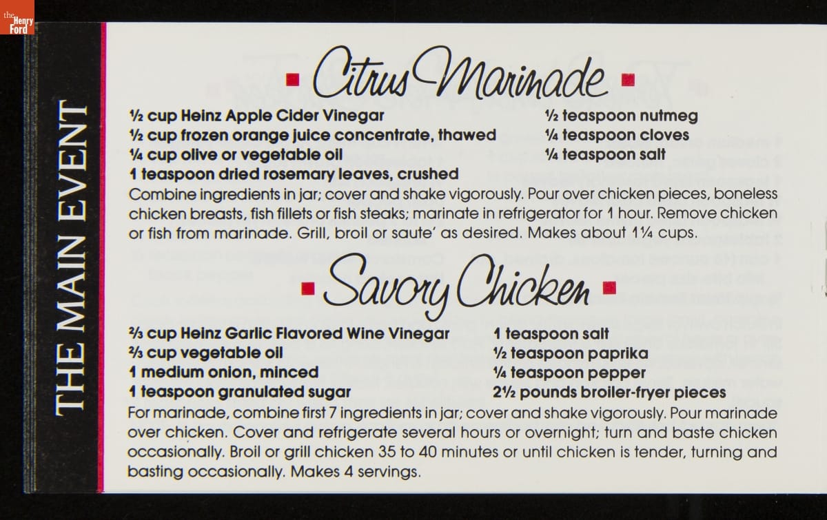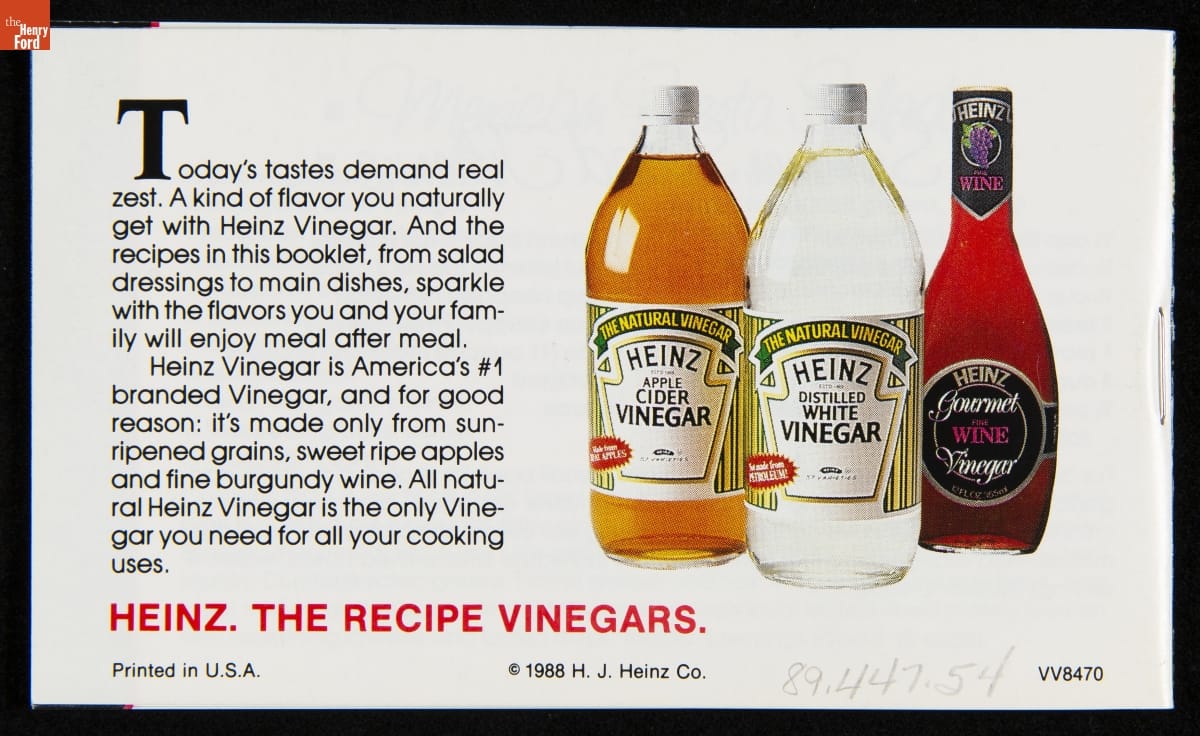 Recipe booklets and cook books can be general or specific in the range and type of food featured within their pages. Like other manufactured food companies, the H.J. Heinz Company published recipe booklets which featured recipes using their products. This recipe booklet from 1988 provides recipes for dishes utilizing Heinz Vinegar products.