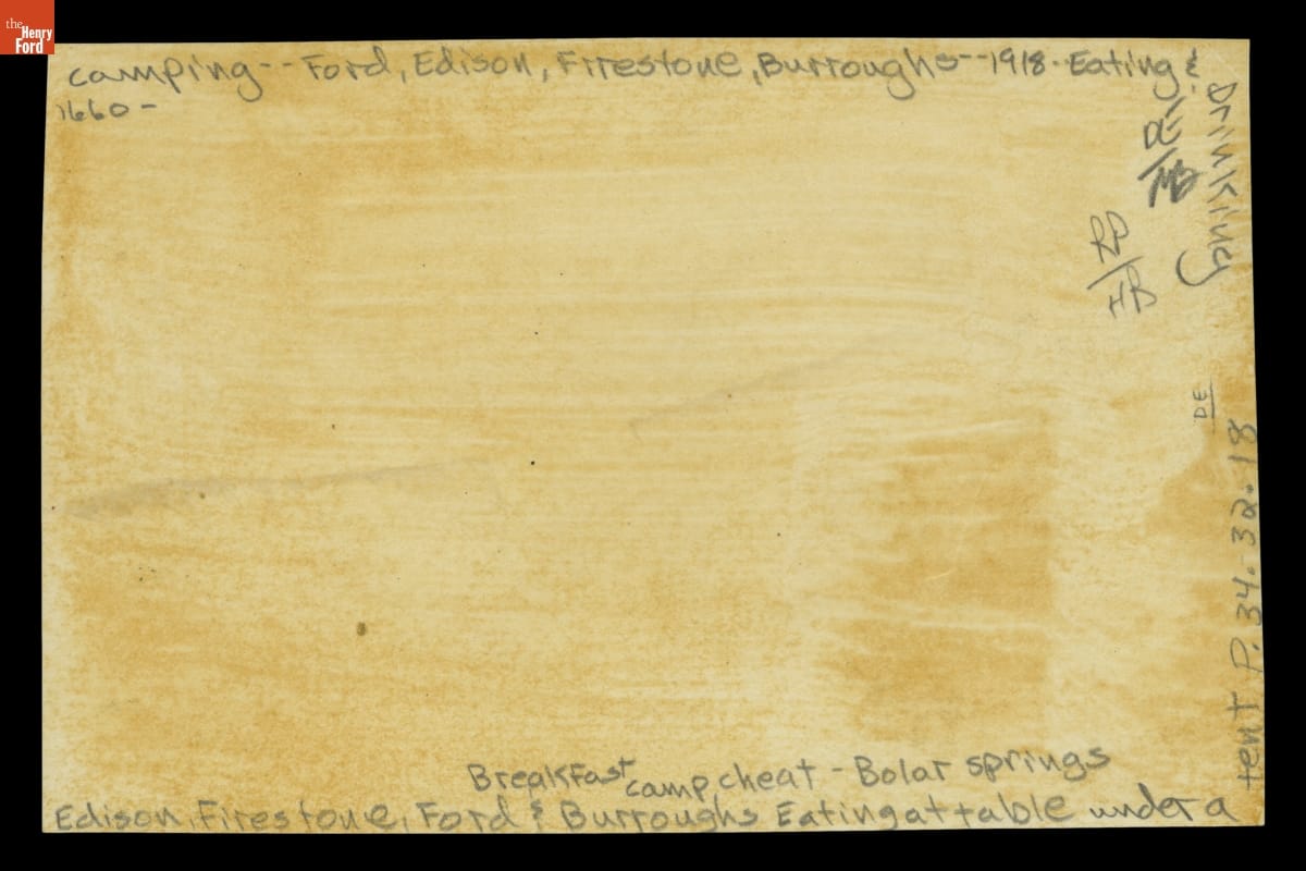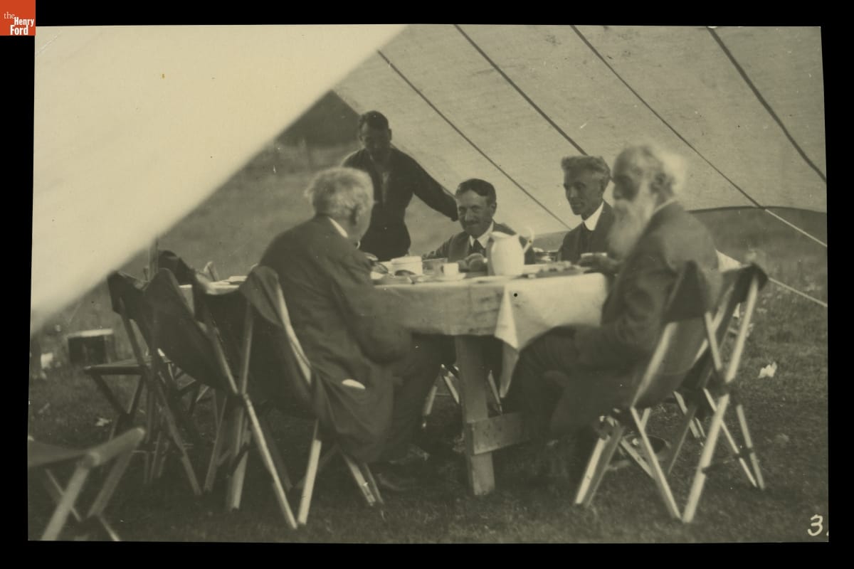 Thomas Edison, Henry Ford, Harvey Firestone, and John Burroughs eat breakfast underneath a tent at Camp Cheat, near Bolar Springs, Virginia, in 1918. The group, calling themselves Vagabonds, took several camping trips together throughout the eastern United States.