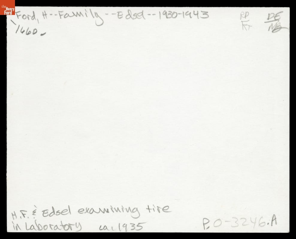 Henry Ford and Edsel Ford Examining Tire in Laboratory, circa 1935