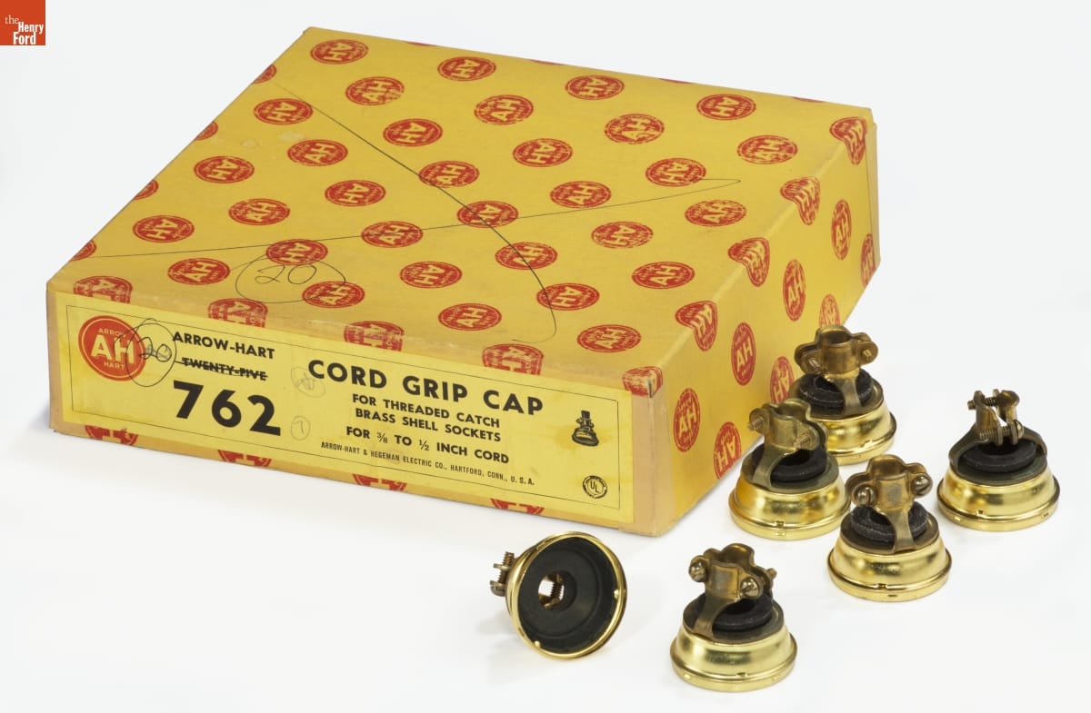 ARROW-HART/ TWENTY-FIVE [crossed out] CORD GRIP CAP/ FOR THREADED CATCH/ BRASS SHELL SOCKETS/ FOR 3/8 TO 1/2 INCH CORD/ 762/ ARROW-HART & HEGEMAN ELECTRIC CO., HARTFORD, CONN., U.S.A.