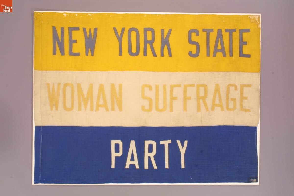 This banner was carried in rallies and marches by members of the New York State Woman Suffrage Party. Reformers had been advocating giving women the vote since the 1840s. However, it was not until the passage of the 19th amendment in 1920 that women gained the vote.