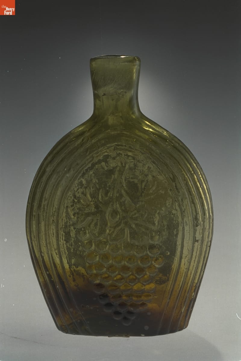 Glass factories in America began producing inexpensive, mold-formed flasks in the early 1800s. These figured flasks, often decorated with symbols of national pride or political or cultural affiliation, appealed to America's common man. Many flasks, like this one, contain images of an eagle -- a symbol for America. The grapes, on the reverse, refer to agriculture and perhaps the flask's alcoholic content.