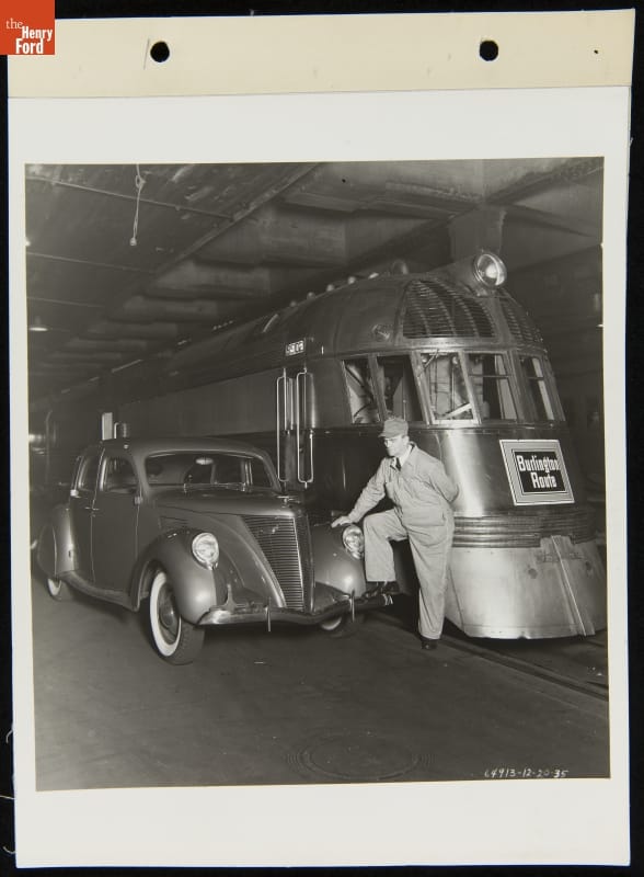 This publicity photo posed a Lincoln Zephyr automobile beside the Chicago, Burlington & Quincy Railroad's Pioneer Zephyr. In 1934 the streamlined train made a widely publicized run from Denver to Chicago in just over 13 hours, maintaining an average speed of 77 miles per hour. It's no coincidence that Lincoln gave its streamlined car, introduced in 1935, a similar name.