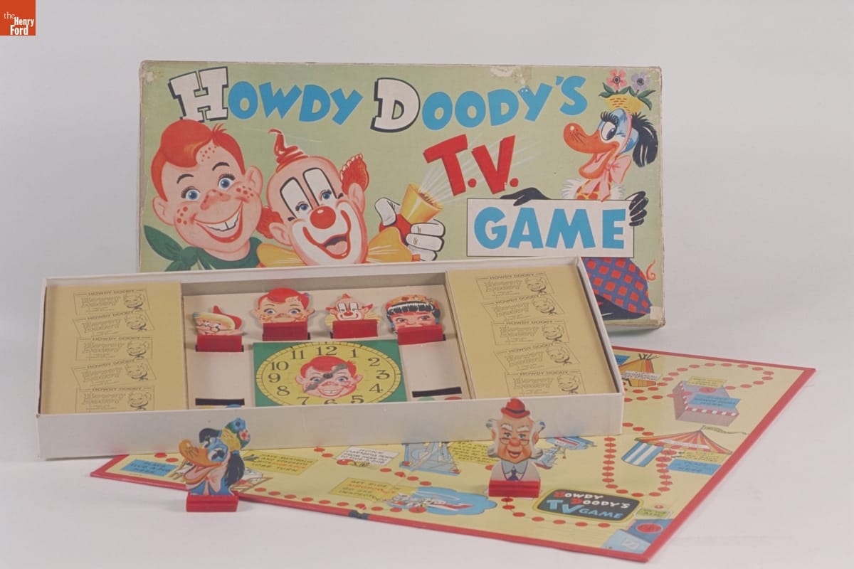 This board game is based on the Howdy Doody show, a television show introduced in 1947 and one of television's first full-fledged hit for children; it also won the approval of parents. The board game was an early example of the way in which television and manufacturers of toys and other products could collaborate for mutual benefit.