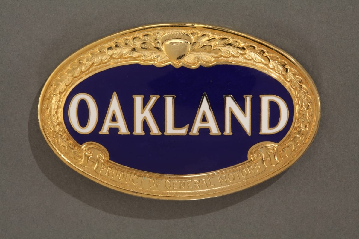 This oval emblem consists of the company name surrounded by an oak leaf wreath topped with an acorn. The inscription in the banner states that Oakland is a product of General Motors. Oakland began as an independent company in 1907, but in 1909 became part of the newly formed General Motors Corporation. The Oakland brand name lasted until 1931.