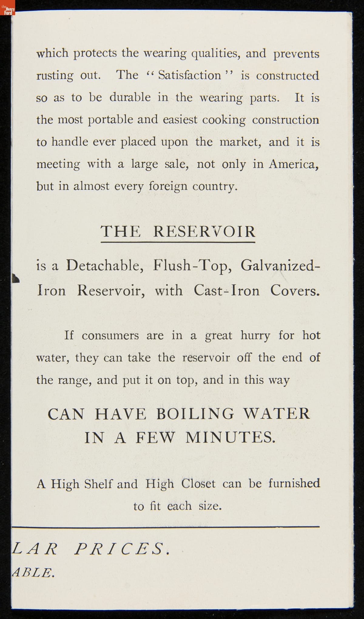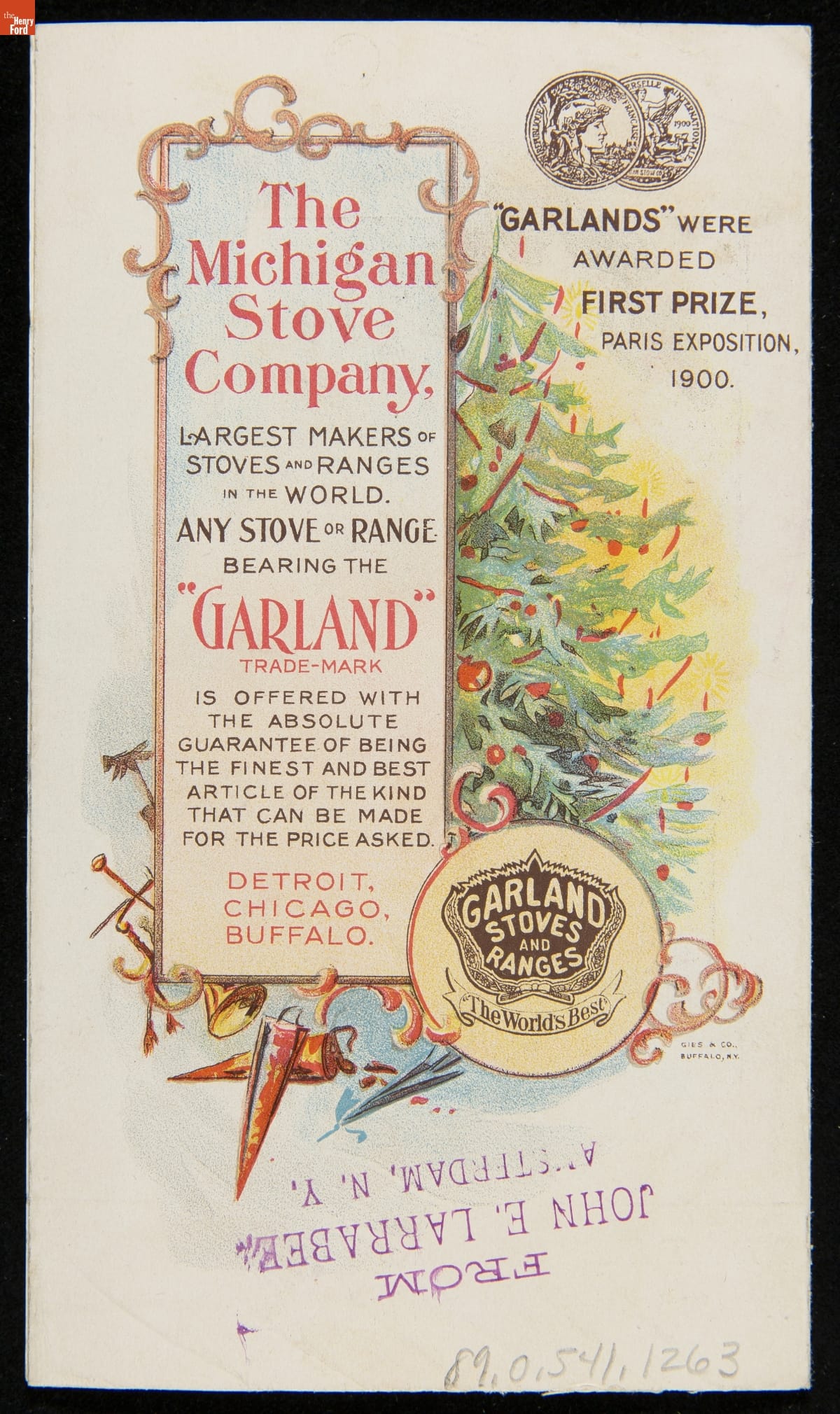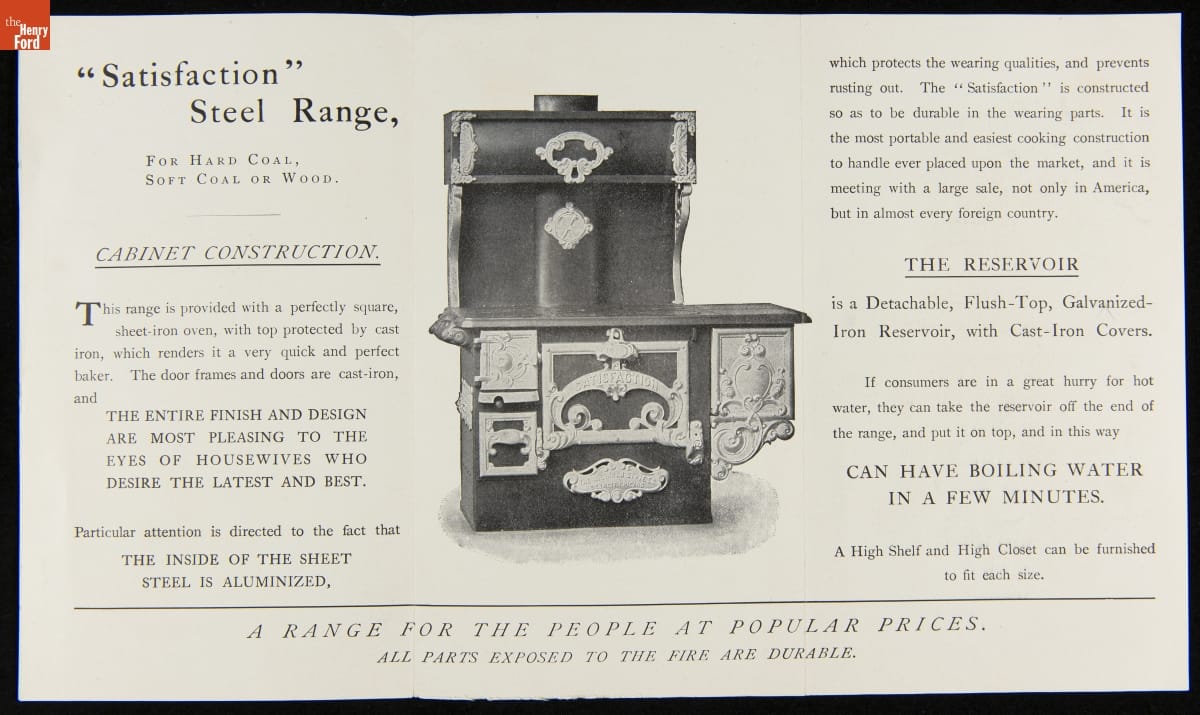 As color printing gained momentum in the late 19th century, trade cards became a major means of advertising goods and services. Americans enjoyed and often saved the little advertisements found in product packages or distributed by local merchants. This trade card unfolds to reveal information about the "Satisfaction" Steel Range made by the Michigan Stove Company.