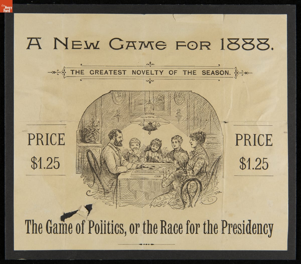 Two teams race for the presidency in the late-1880s board game advertised here. The would-be politicians must first get elected to various offices before running for president. Vote cards help teams capture the nomination and, later, a state's electoral vote. The team receiving the majority of the Electoral College votes (just like today's elections) wins!