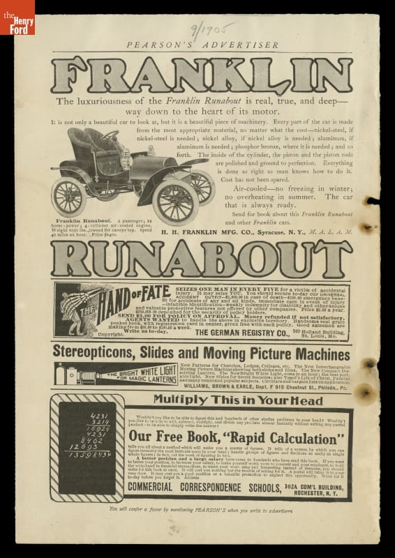 Upscale Franklin automobiles, built from 1902 to 1934 in Syracuse, New York, were distinguished by their air-cooled engines. No radiator or water meant less weight, and no danger of the cooling system boiling over in summer or freezing in winter. Some 150,000 Franklins were built over the company's 32 years, making it the most successful American air-cooled car.