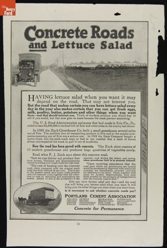 The Portland Cement Association, a trade group promoting the use of Portland cement, published this advertisement in 1919 to support road improvements. The ad used the example of fresh lettuce, stating that it could be delivered more economically over paved highways versus dirt roads. Of course, cement producers stood to profit from the construction of paved roads.