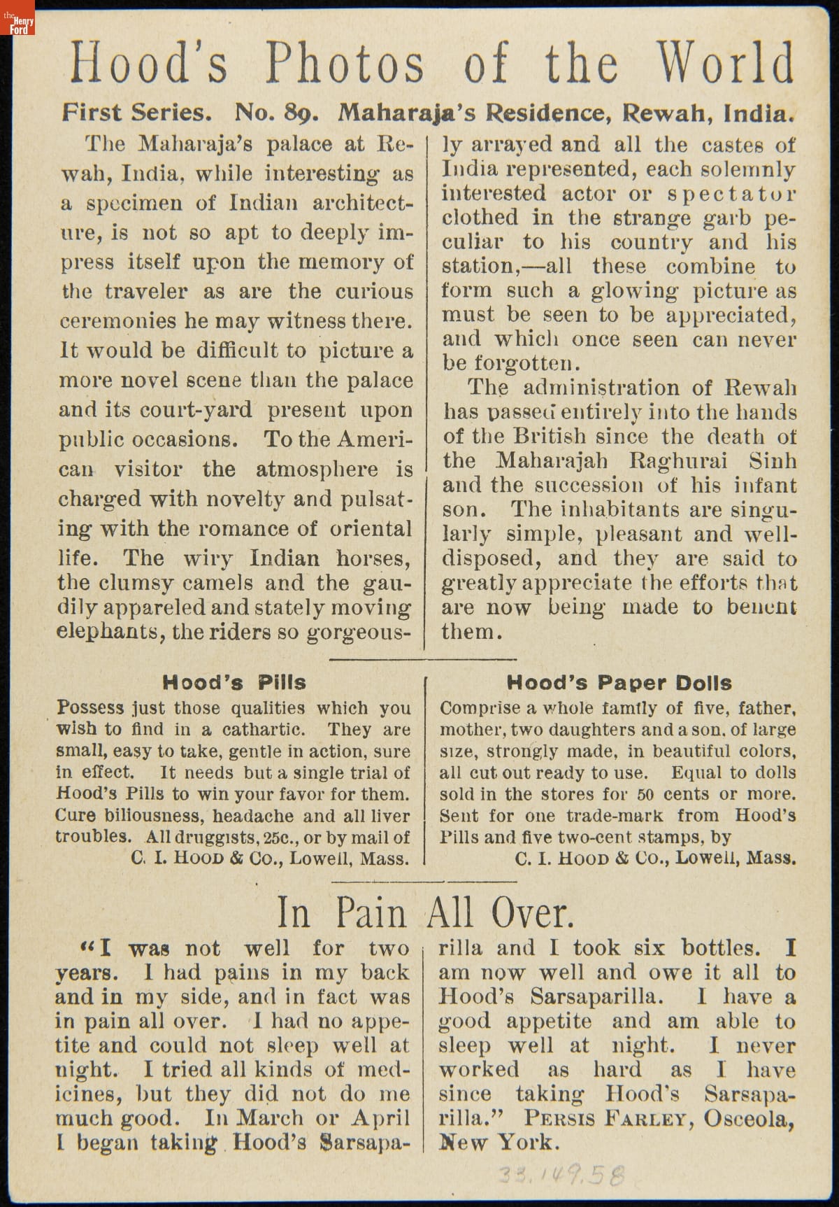Trade Card for C.I. Hood & Co. with Hood's Photos of the World, "Maharaja's Official Residence at Rewah, India," 1890-1910
