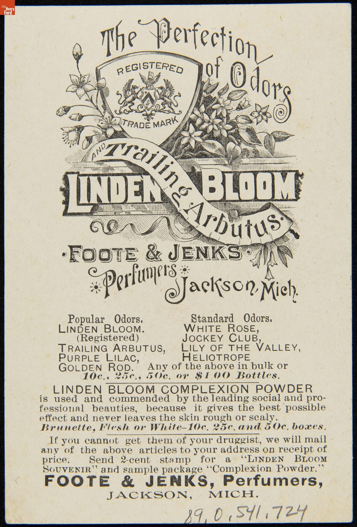Trade Card for Foote & Jenks, "The Perfection of Odors "Linden Bloom" For Sale By Your Druggist," 1884-1900