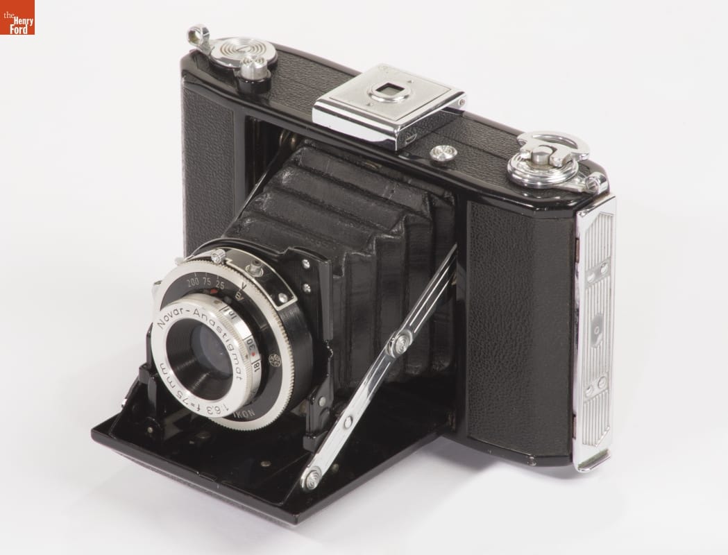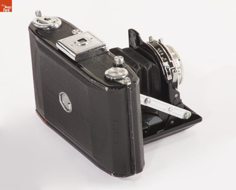 Folding cameras were designed to be portable and rugged. The lens sits at the end of a collapsible bellows system, often adjustable to provide better focus. The camera's back typically contains 120 roll film, with multiple exposures on a roll. Popular from 1900 until the introduction of 35mm film in 1945, many amateur photographers owned cameras like this.