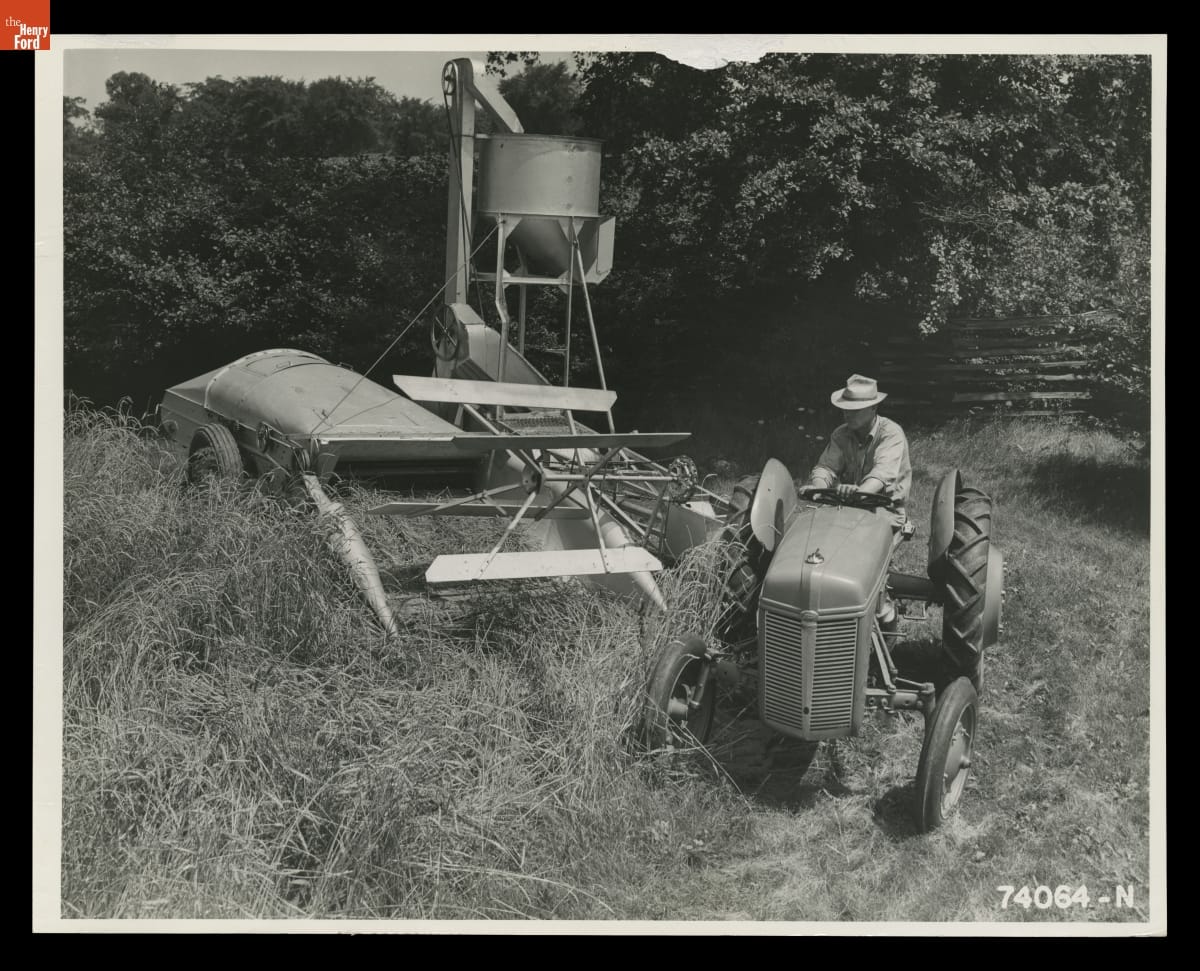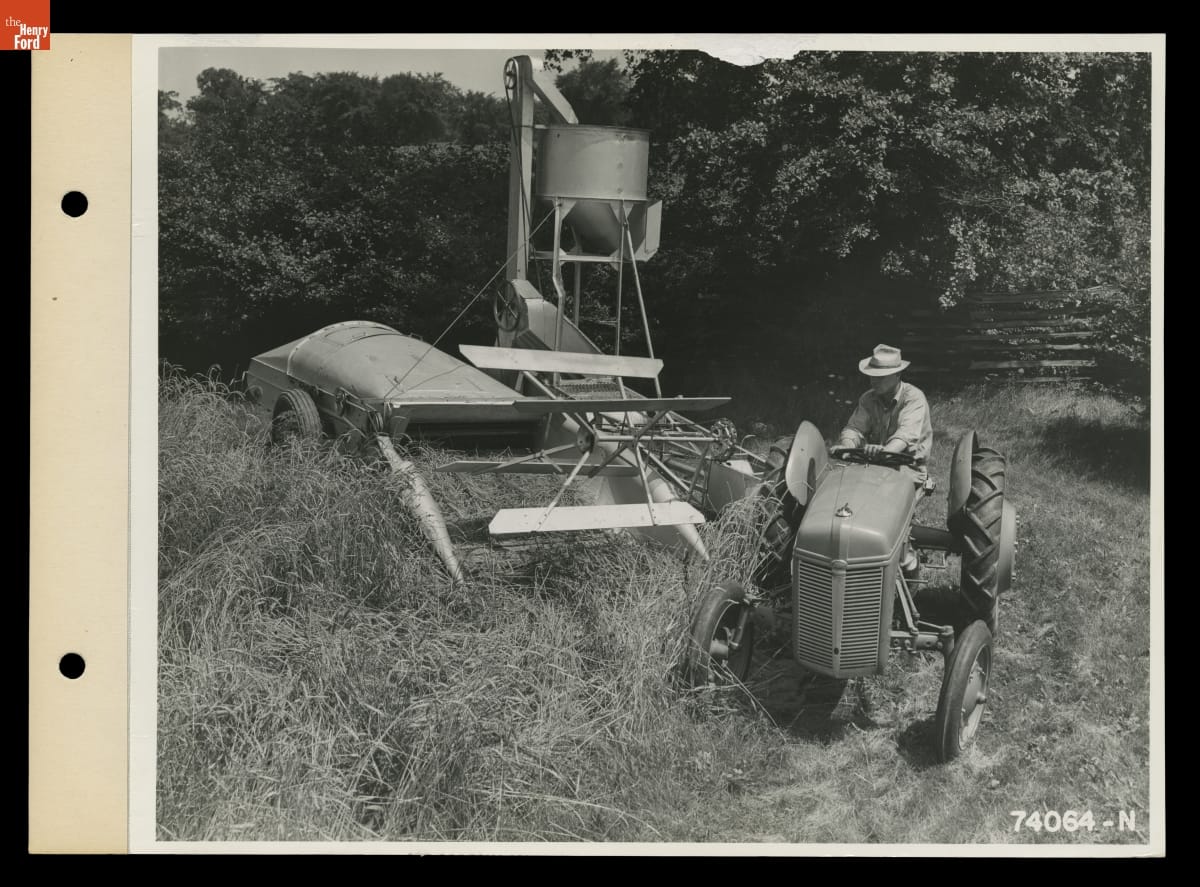 Ford Motor Company introduced the 9N tractor in 1939. It featured the "Ferguson System:" a 3-point hydraulic hitch-and-lift system invented by Irishman Harry Ferguson. Ferguson's revolutionary hitch kept agricultural implements, like the combine seen here, in line with the tractor. It also provided stability. By 1940, nearly 8 percent of tractors sold in the U.S. were 9Ns.