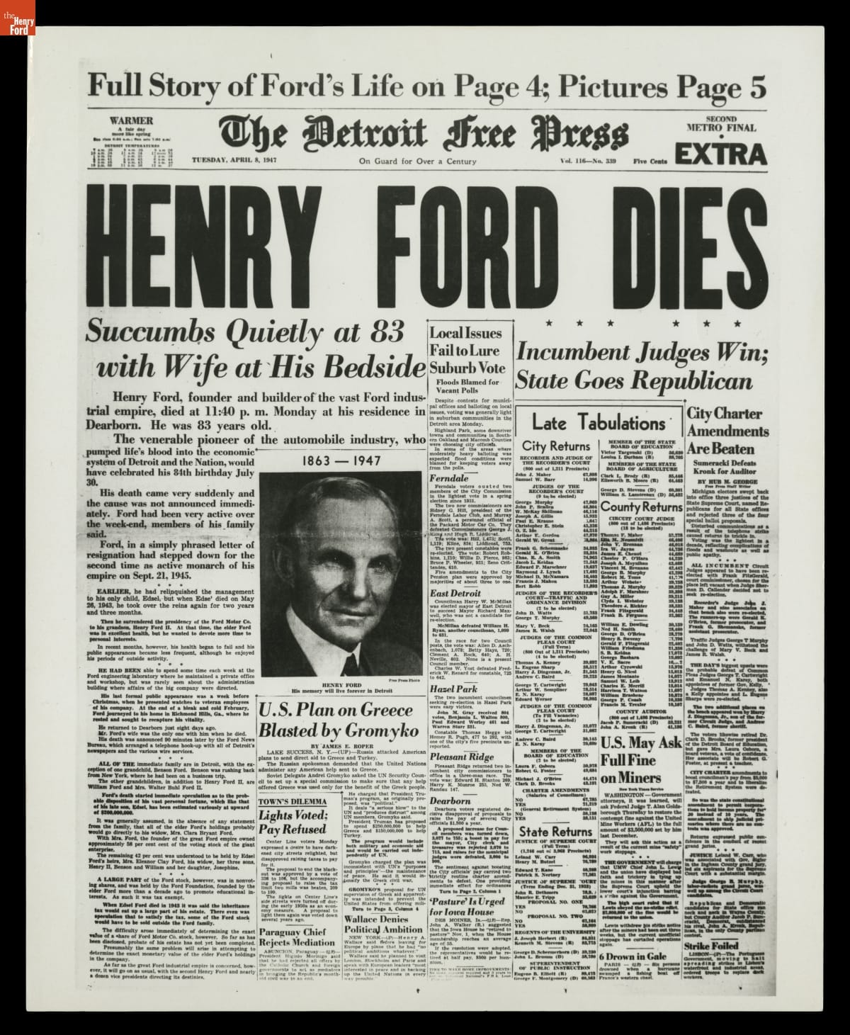 "Henry Ford Dies," Headline in the Detroit Free Press, April 8, 1947