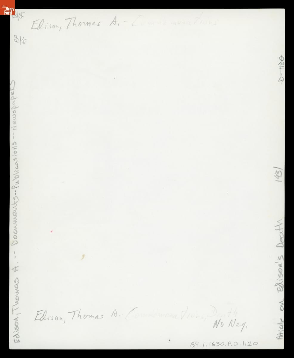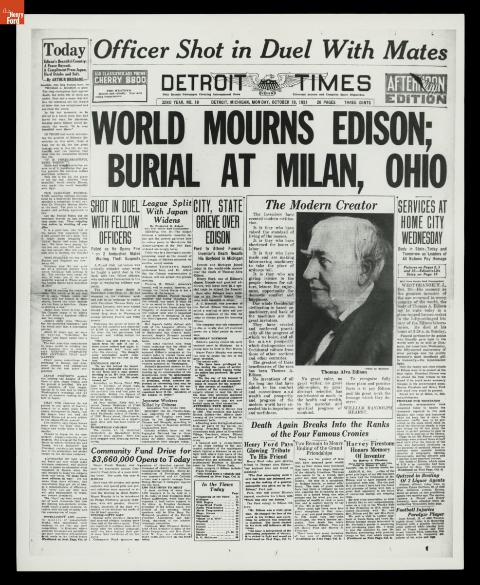 Front Page of Detroit Times Newspaper with Headline, "World Mourns Edison," October 19, 1931