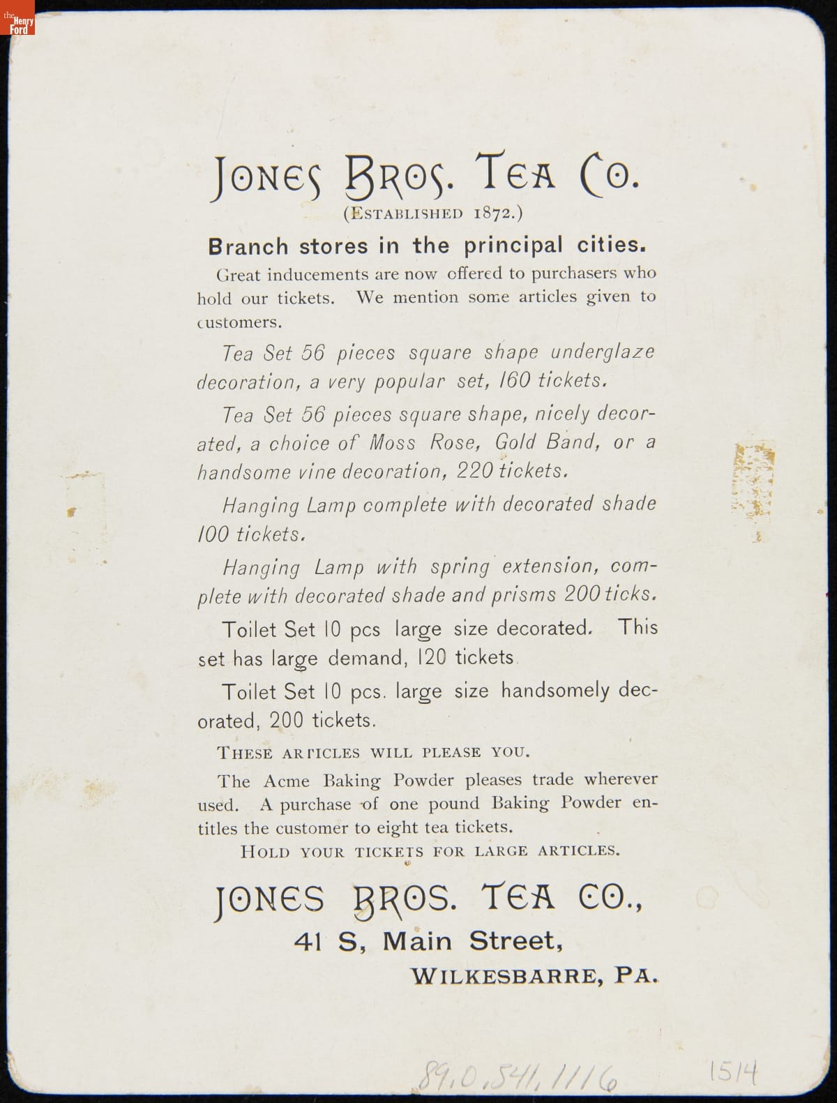 Trade Card for Jones Bros. Tea Company, 1872-1892