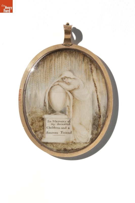 Before the 20th century, death came early and often. One way people coped was to wear jewelry as memorials to their loved ones. Over the centuries, mourning jewelry followed the prevailing fashions. Shortly after independence, Americans favored illuminated, miniature brooches and pendants painted on ivory. These featured shapes derived from classical design, symbols such as urns and weeping women dressed as ancient Romans.