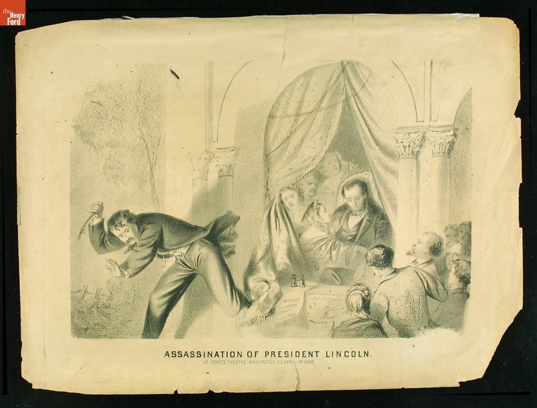 Before the existence of newspaper photos and television, lithographs helped people to understand the tragic event of President Abraham Lincoln's death in April 1865. This shows the assassin escaping after shooting President Lincoln at Ford's Theatre in Washington, D.C., on April 14, 1865. Printmakers produced various versions of this event, based on verbal reports.