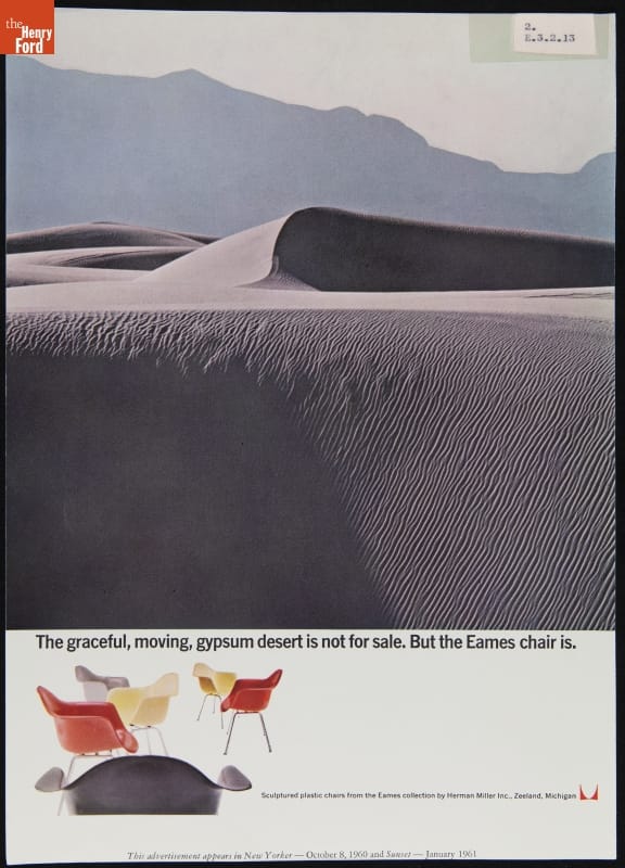 Herman Miller Advertisement, 1960-1961, "The Graceful, Moving, Gypsum Desert is Not for Sale. But the Eames Chair Is."