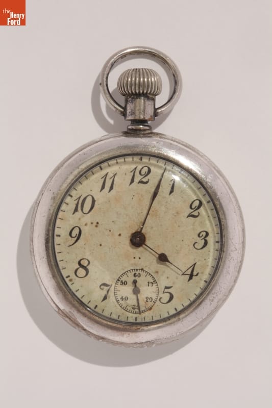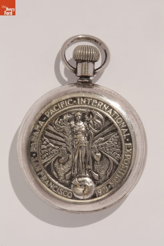 The Panama-Pacific International Exposition celebrated the 1914 completion of the Panama Canal and the 400th anniversary of the discovery of the Pacific Ocean. Nearly nineteen million people visited San Francisco, recently recovered from a devastating 1906 earthquake, during the fair in 1915. Many returned home with mementos of the exhibition, such as this souvenir pocket watch.