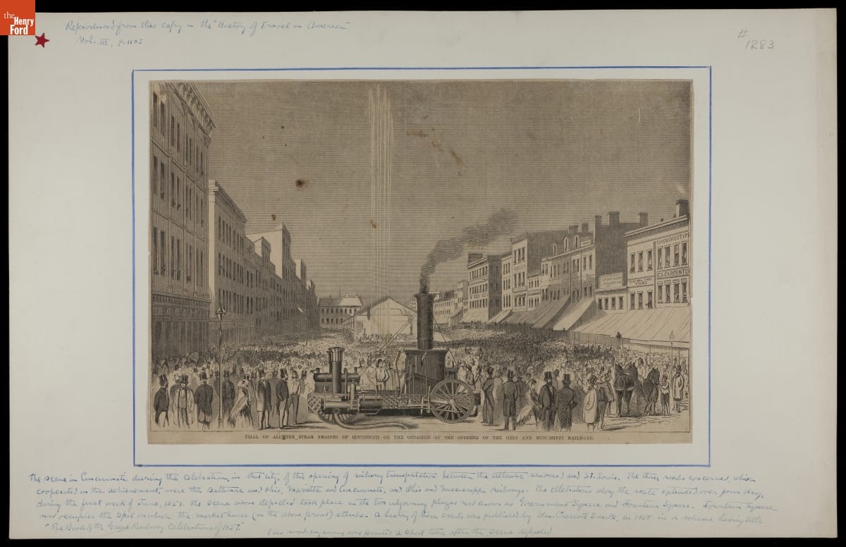 In the 19th century, the opening of a new railroad was a source of civic pride and a cause for celebration. The Cincinnati Fire Department paraded its steam-powered equipment to mark the completion of the Ohio & Mississippi Railroad in 1857. The O&M became a part of the Baltimore & Ohio Railroad's mainline to St. Louis in 1893.