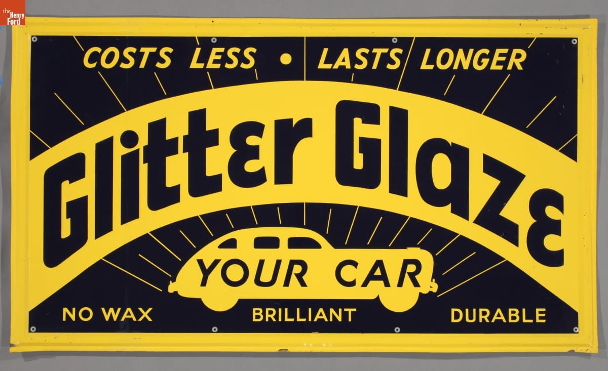 Potential customers seeing this sign at a service station would know that Glitter Glaze weatherproofing was sold there. According to a 1946 Popular Mechanics ad, Glitter Glaze was a "brilliant hard durable coating that protects the [car's] finish regardless of climatic conditions." The manufacturer promised that it "contains no wax or grease, and won't chip, crack or peel."