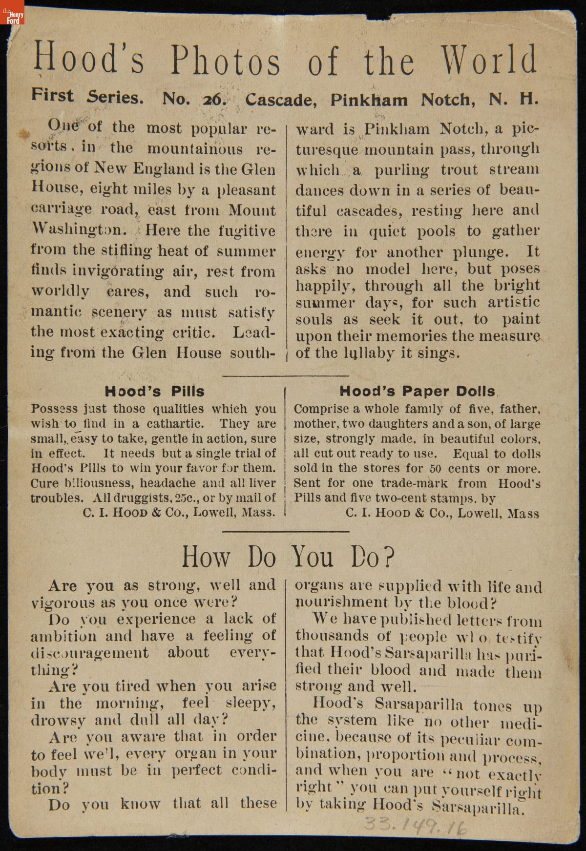 In the late 19th century, trade cards were a major means of advertising goods and services. Patent medicine producer, C.I. Hood & Co., had its own advertising department, creating cookbooks, calendars, and, most abundantly, trade cards. The trade card series, "Hood's Photos of the World," became popular among consumers, as it offered views of far-away places, providing a window to the broader world.
