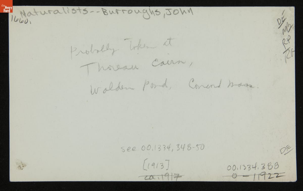 In 1913, naturalist John Burroughs accompanied by a group of friends visited Concord, Massachusetts, where two of Burroughs's early literary influences -- Ralph Waldo Emerson and Henry David Thoreau -- once resided. Burroughs and his traveling companions visited Emerson's home, Walden Pond and the gravesites of the two 19th-century Transcendentalists.