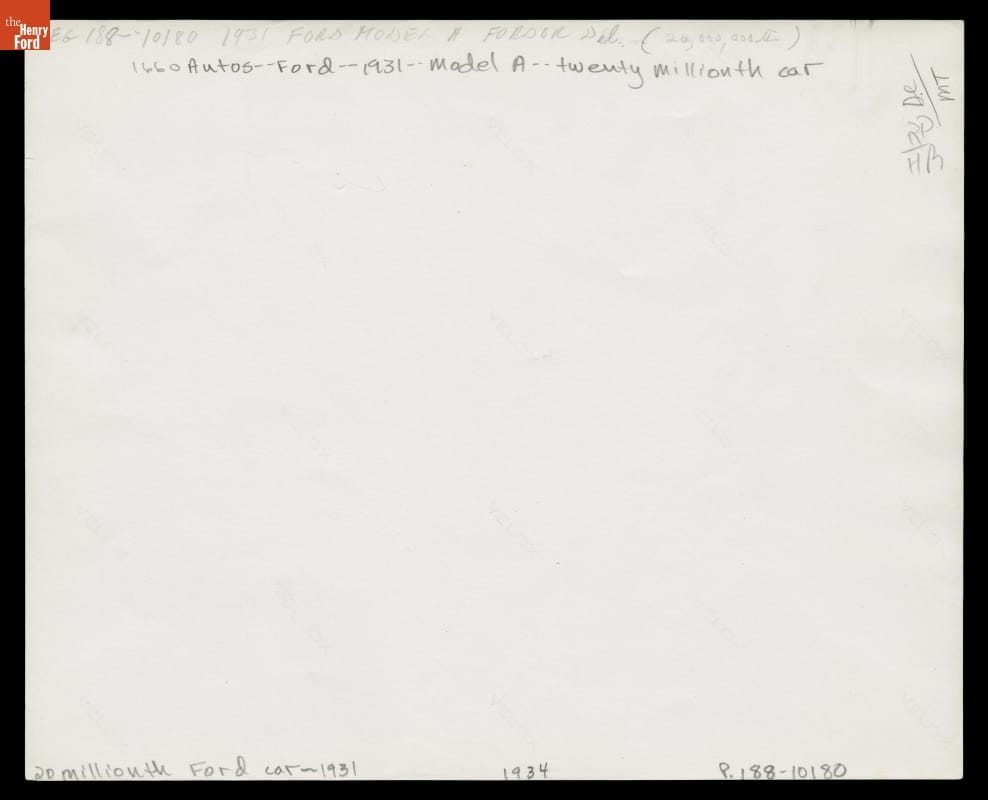 The Ford Motor Company produced its 20 millionth automobile -- a black Town Sedan -- in 1931. The car rolled off Ford's Rouge plant assembly line on April 14th, and it then embarked on a nationwide publicity tour. This photograph shows the vehicle on display at The Henry Ford in Dearborn, Michigan.
