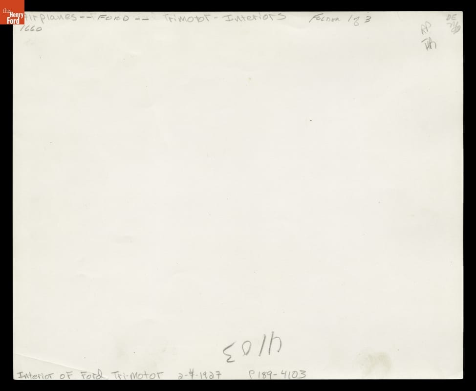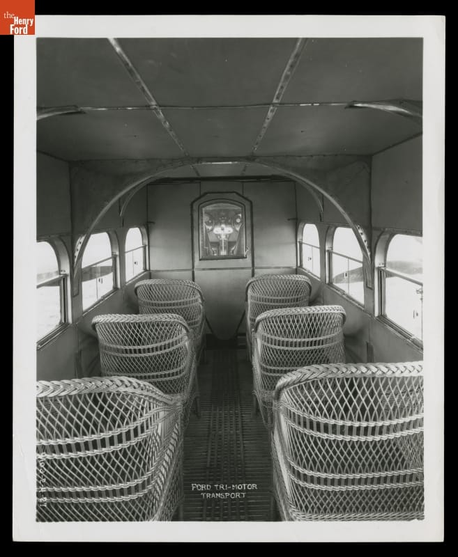 Model 4-AT and 5-AT Tri-Motors were designed and built by the Stout Metal Airplane Company, a division of Ford Motor Company. These rugged planes earned a reputation for being safe and dependable; and in the late 1920s and 1930s they were the backbone of the scheduled airline industry. This photograph shows the interior of a 4-AT equipped with lightweight wicker seats used for passenger service.