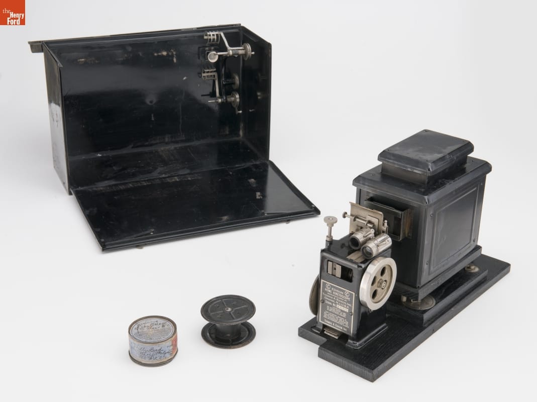plaque: EDISON HOME KINETOSCOPE / MANUFACTURED BY THOMAS A. EDISON, INC. / ORANGE, N.J., U.S.A. / SERIAL NO. 3055 / PATENTED No. 578.185, MARCH 2 1897 - No. 586,953. JULY 20, 1897. OTHER PATENTS PENDING. THIS PATENTED MACHINE IS NOT LICENSED FOR USE IN THE UNITED STATES, ITS TERRITORIES AND POSSESSIONS (EXCEPT ITS INSULAR POSSESSIONS AND ALASKA) Case: Edison film canister: Joining of the Oceans-Class B-Patented in the United States Aug. 31 1897-Reissued January 12 1904/No. 12,192.