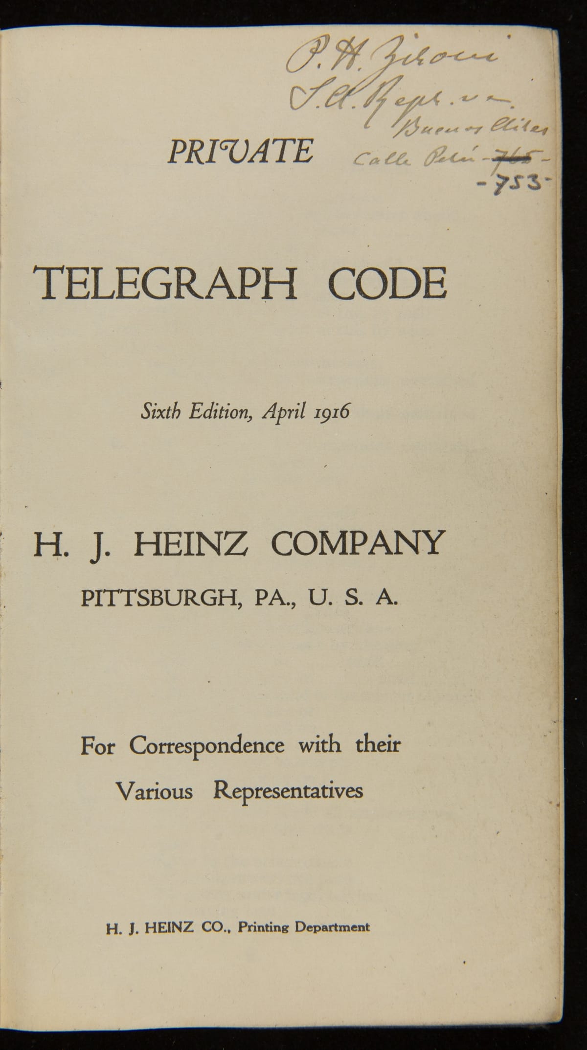 H. J. Heinz Company Private Telegraph Code Book, April 1916
