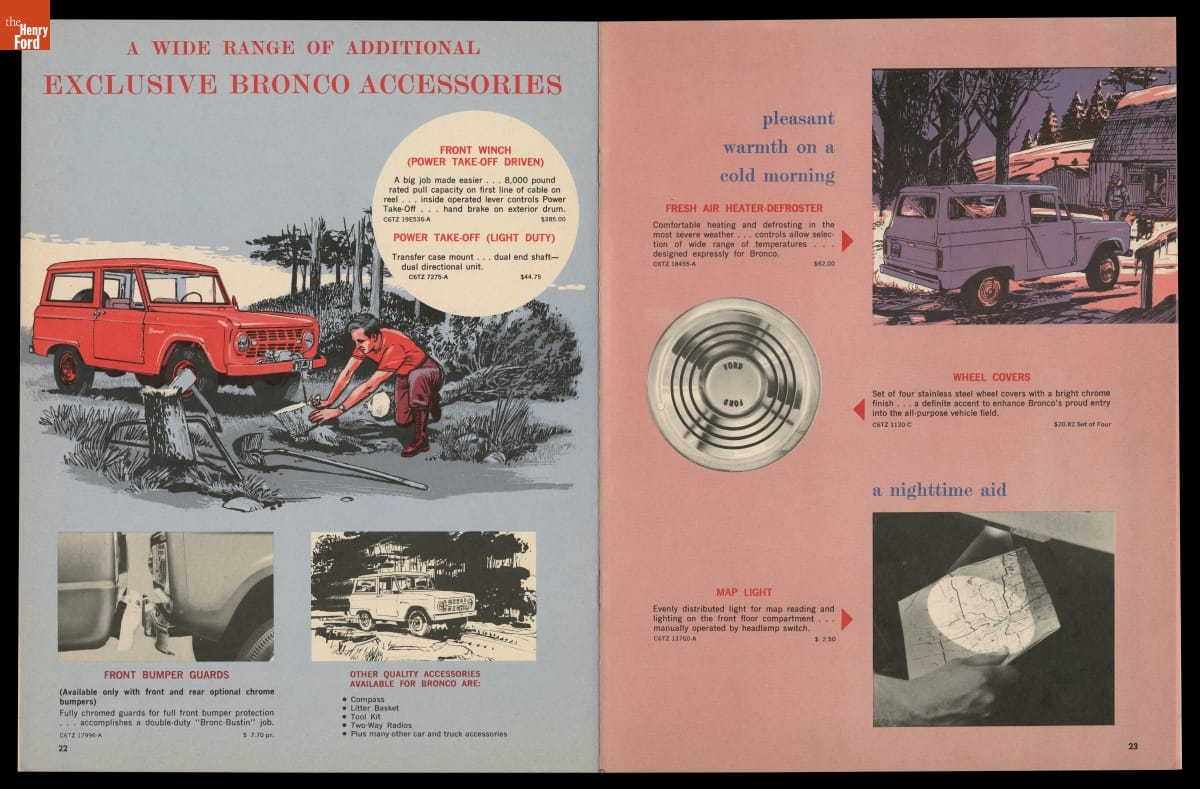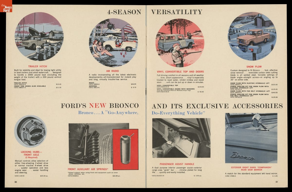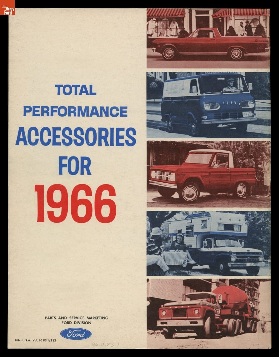 Ford advertised available accessories for many of its popular models in this 1966 brochure. The all-new Ford Bronco was featured prominently. The multi-purpose Bronco was introduced to compete with similar vehicles like the Jeepster Commando and the International Harvester Scout. Ford built its "Total Performance" marketing campaign around the company's many racing successes.