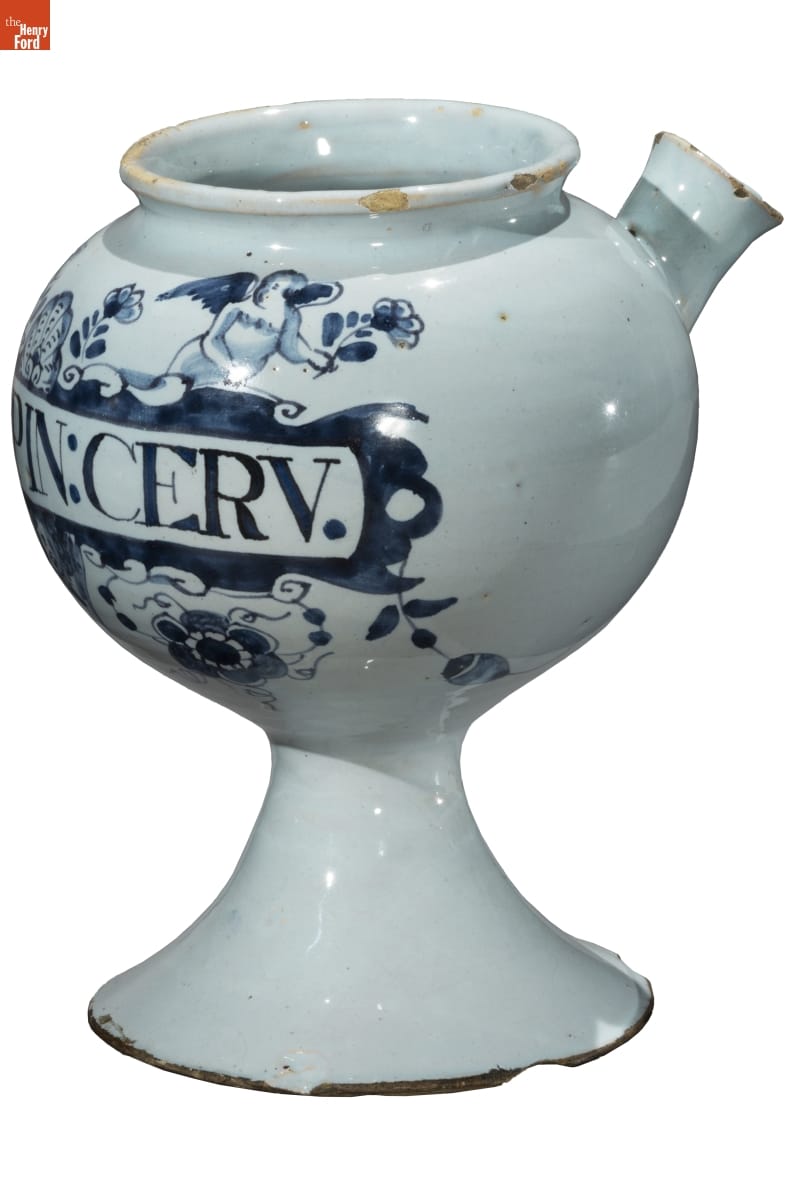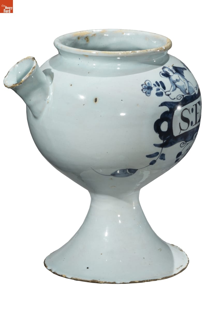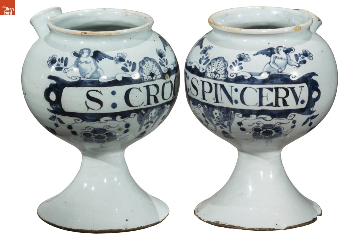 Eighteenth-century druggists displayed jars, like this one, in their apothecaries. These drug jars held various substances thought to promote health and well-being. The labels provided quick identification of ingredients, while the decorative containers conveyed the druggist's worldliness and professionalism to those in need of health services.
