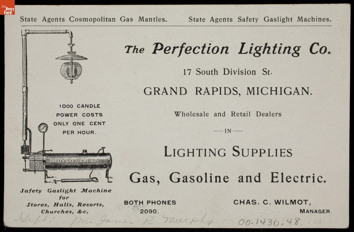 Product made by Perfection Lighting Company, Charles Wilmot, manager, Grand Rapids, Michigan