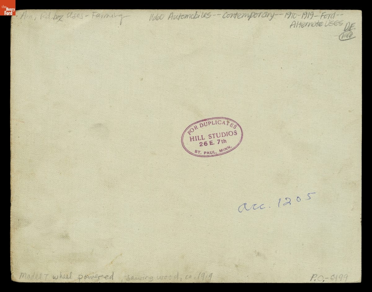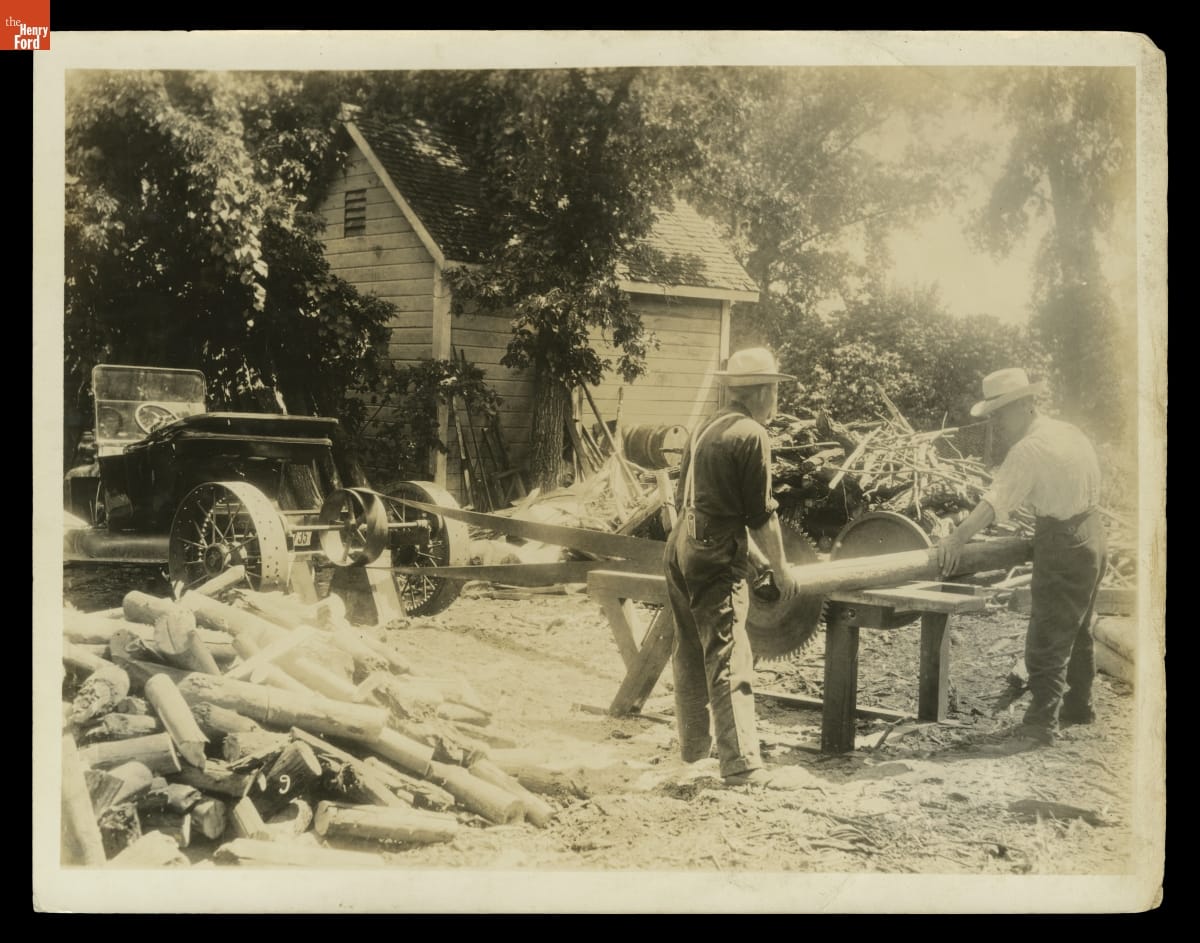 Innovative users adapted the Ford Model T to their needs. The Ford's rear axle powered many types of belt driven machinery. This photograph taken about 1919 shows men preparing to cut wood on a portable sawmill powered by a Model T.