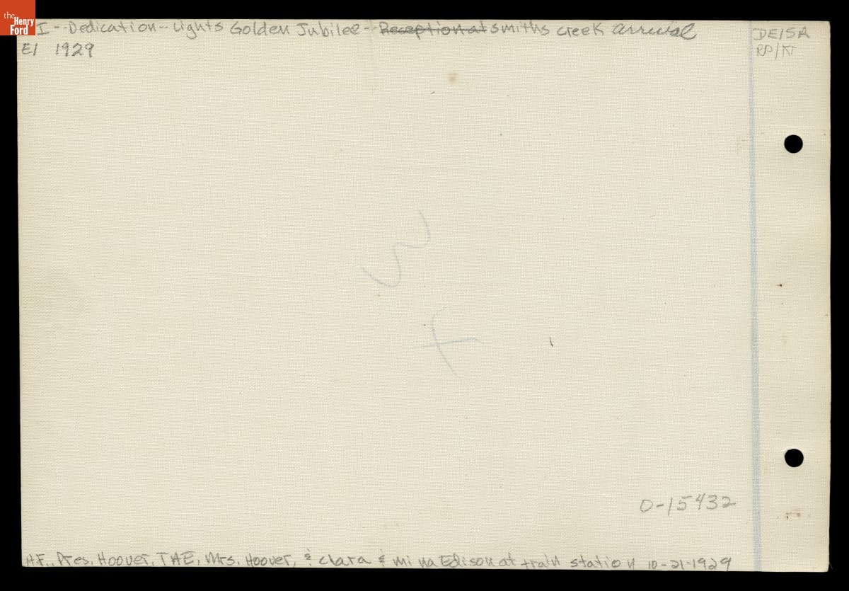 On October 21, 1929, Henry Ford hosted an elaborate celebration in Dearborn, Michigan, to honor his friend Thomas A. Edison. Known as Light's Golden Jubilee, the date marked the 50th anniversary of Edison's invention of a practical incandescent lamp. The day's festivities began with Edison's arrival -- escorted by Ford and President Hoover -- at Smiths Creek Station in Ford's Greenfield Village.