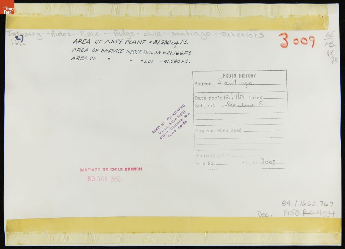Ford Motor Company operated sales and service branches, as well as assembly plants, in cities around the world. This photograph shows the company's branch in Santiago, Chile. Ford had South American subsidiary companies based in Argentina, Brazil, and Venezuela.