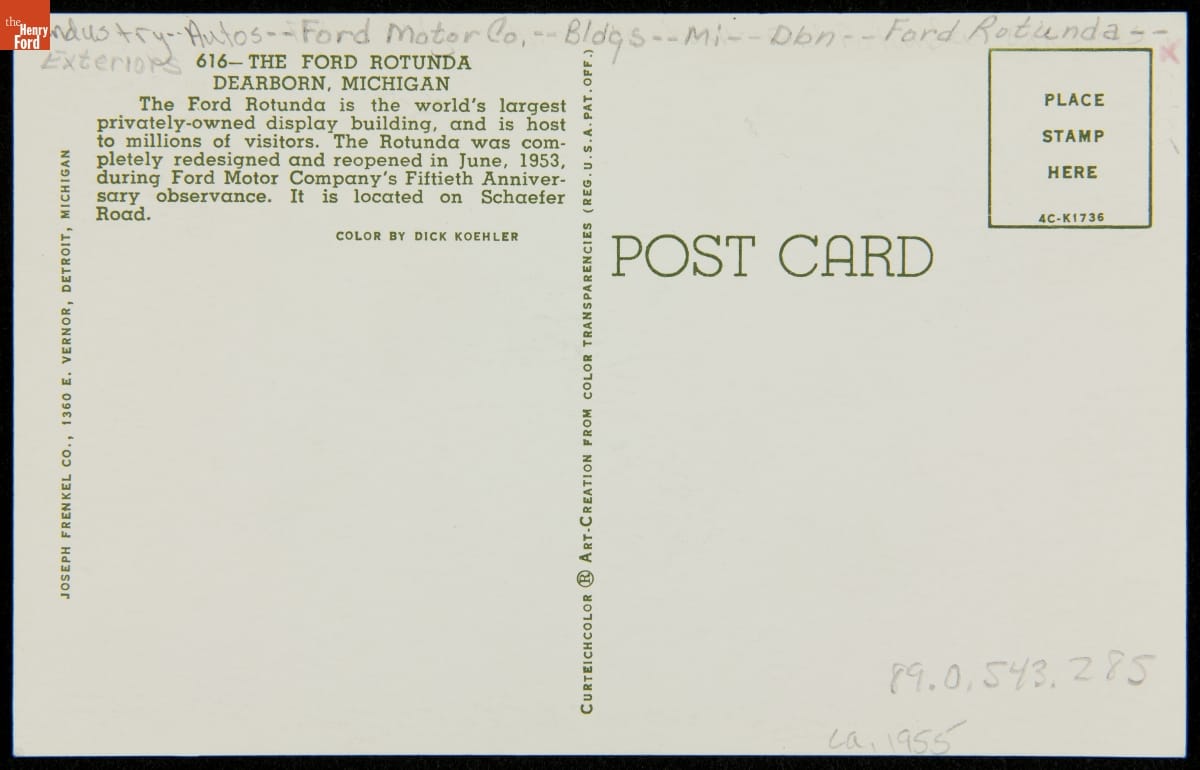 After the Century of Progress Exposition ended in 1934, Ford Motor Company brought its central Rotunda building from that fair back to Dearborn. From 1936 to 1962, Ford recreated the excitement of a World's Fair exposition on its home turf. This postcard shows the Ford Rotunda as it looked in 1954.